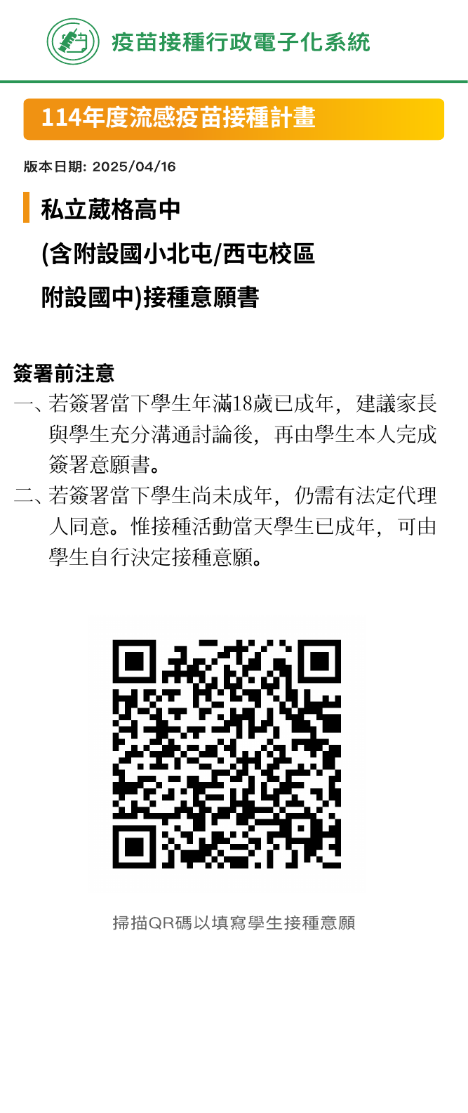 114年度公費流感疫苗,衛生單位將安排10/9(四)入校施打,請家長點接種疫苗連結,即可進入簽署頁面填寫相關資料與簽署意願。