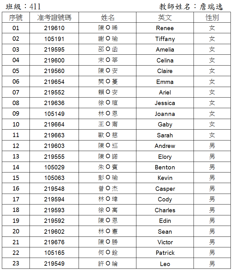 108學年度四年級學生名單